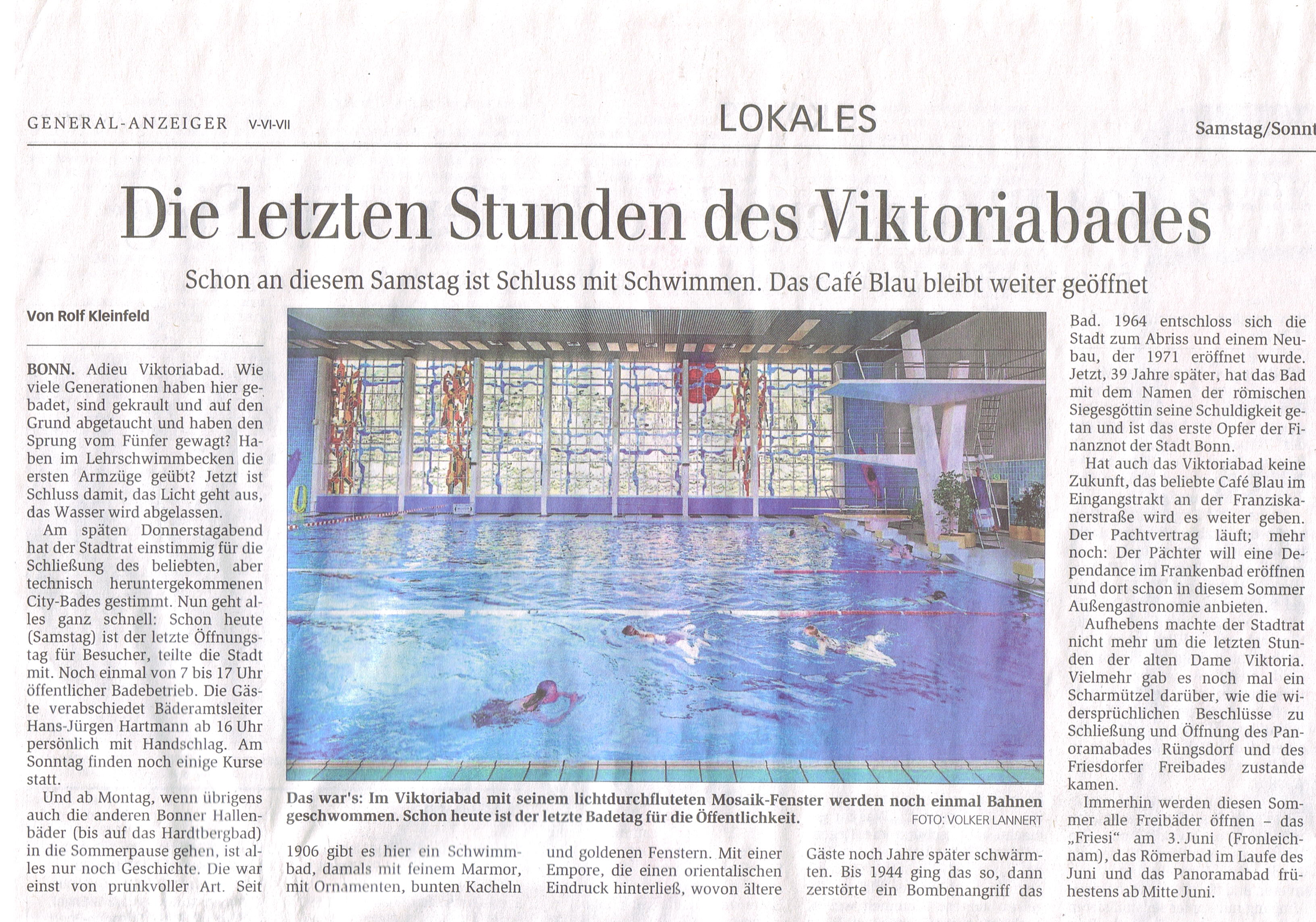 Das Viktoriabad (Viktoria mit k) – seit 1906 in der Bonner Innenstadt – soll geschlossen werden. Der Verein »Unser Viktoriabad e. V.« wehrt sich dagegen und hat diese Website angelegt.